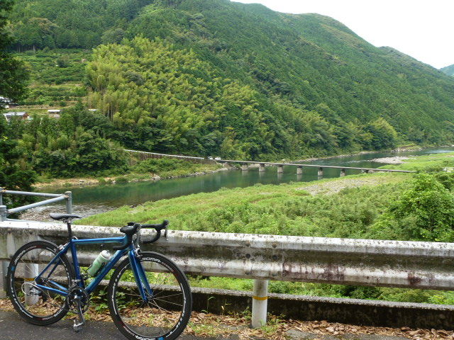 その後、194号線にアクセスし高知方面へ。途中で黒っぽいフェルトかアンカーかに乗ってたローディを追い抜いて中追渓谷へ。戻って194にアクセスしようと古い橋を渡ると、道に出る直前で休憩中のローディ3人と遭遇し会釈。そして道に出ると、目の前にさっき追い越したローディが。なんか追い越すのが気まずかったので、距離をとりつつ後ろをついて行った。