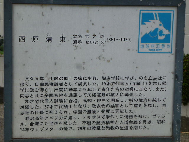 さて、カボチャ地区(失礼!)を進んでいると、数百メートル進んだ先に、西原清東の生誕地碑がありました。西原清東は、アメリカでアメリカ米の起源になったキヨトウサイバラという米の栽培を行った人物。また、いまNHKでやっている大河ドラマ・八重の桜の舞台の一つである同志社英学校の社長に、片岡健吉「片岡健吉の邸宅跡」の後任として就任した人でもあります。こんなところで生まれたんですね。