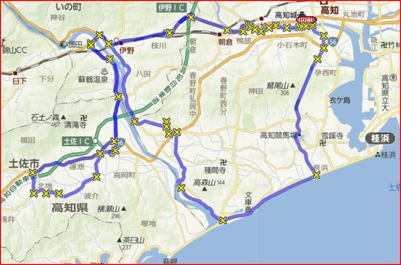 この後、290号経由で56号に移り、土佐市街に向かって進みます。そして39号を北上して仁淀川橋を渡り、いのの街中を通って33号にアクセス。蛍橋電停の手前まで進み、そこから河川敷を通ってみどりの広場に帰還しました。さて、次回は倍の140キロを・・・って、いつのことになるやら。。。