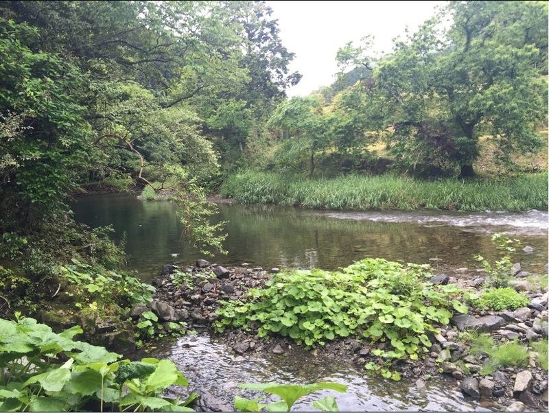 こんな景色が。眼前に川面を望め、河原にはワサビかフキか分からないけど野草が茂っていて、そこを川の水が清らかに流れてて良い雰囲気。そして実は真横に山から流れてくる小さな急流があり、バシャシャシャとたつ水の音がこれまた良い雰囲気を醸しだしてる。癒されますわ。