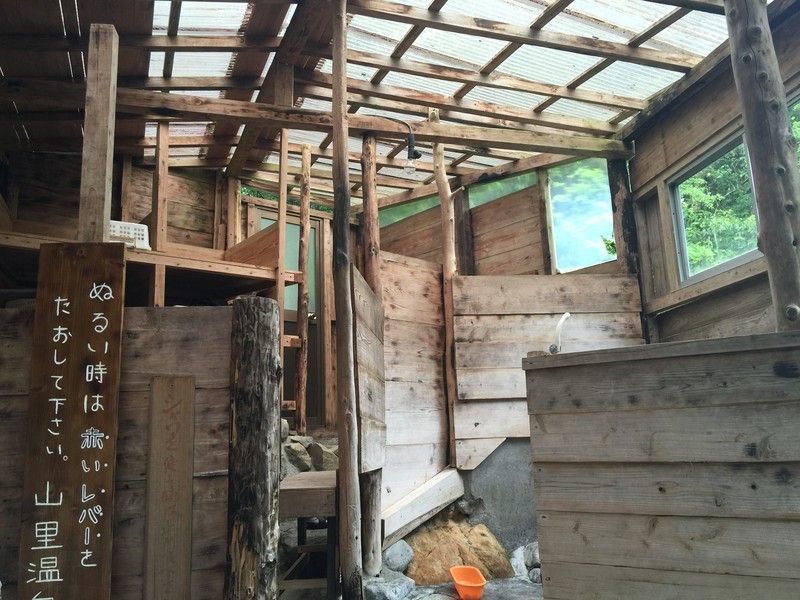 温泉はこの建物↑ではなく河原の近くにあり、広大な庭を立看板に従って移動して、段々と河原に近づいて行った所にあります。この間、柔らかく緑がかった色をしている紅葉の木々を至る所で眺めながら行くんですが、これが良い色してるんですわ。紅葉の時期に行くと、これまたイイ感じになってるんでしょうね。んで、これ↓が温泉。オーナー手作りの温泉です。
