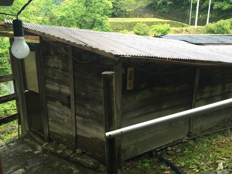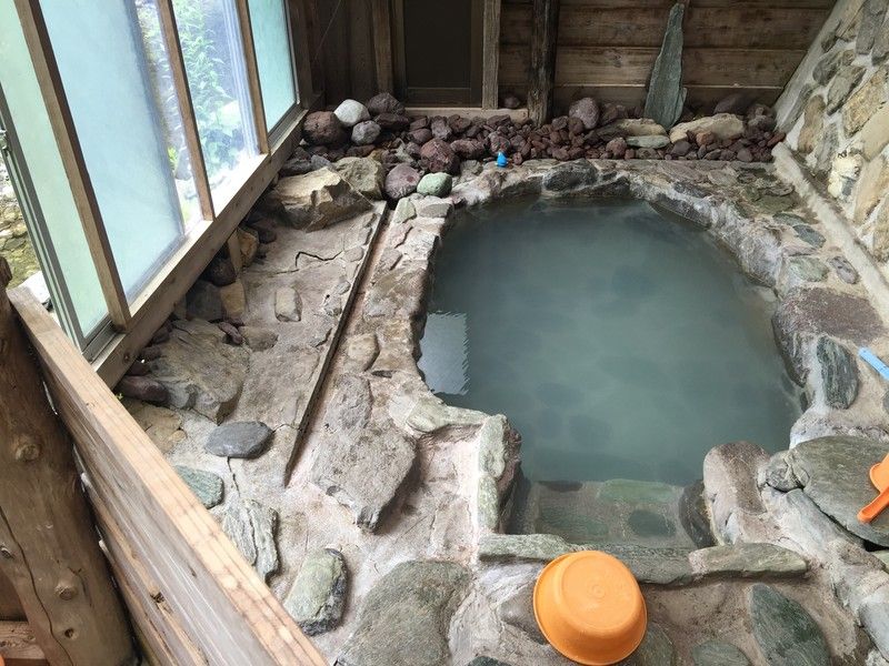 内部です。お世辞にも綺麗とは言い難いですが、登山に行って古い山小屋に入ったと思えば全然気になりません。別に清掃が行き届いてないわけではないですし。これも味があるってことで。ちなみに奥が脱衣所で、手前がシャワースペースです。シャンプー・ボディーソープ等は無く、替わりに自家製造しているらしい固形石鹸があります。オーナーさんが言うには、この固形石鹸で局部だけ洗って湯船に浸かってほしいそうです。