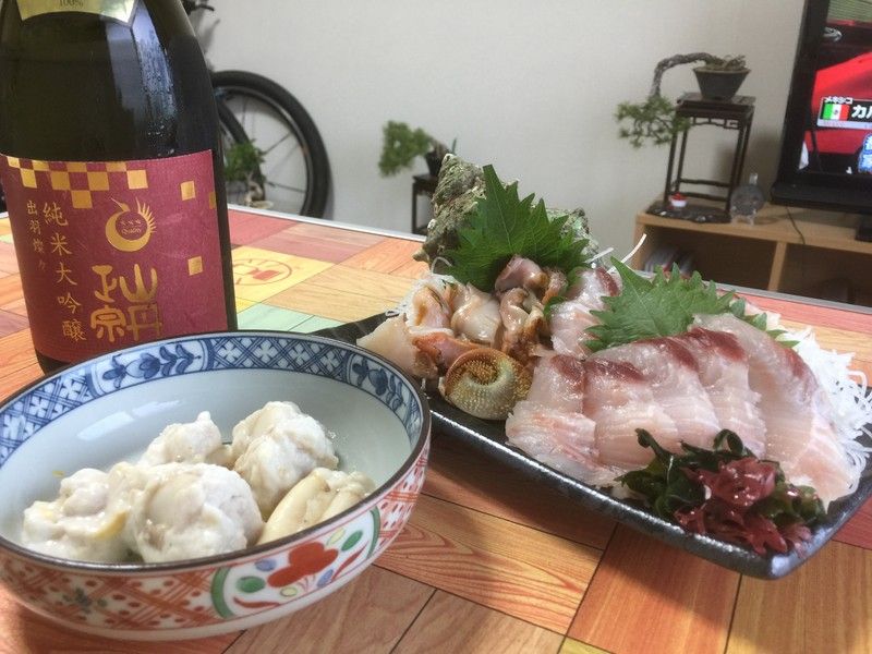 サワラとサザエの刺身と、サワラの白子の湯引きと一緒に飲んでみた。サワラの刺身はあっさりしてるのにマッタリ濃い甘みがあって、同様に甘いのに苦味もある出羽燦々と合う。